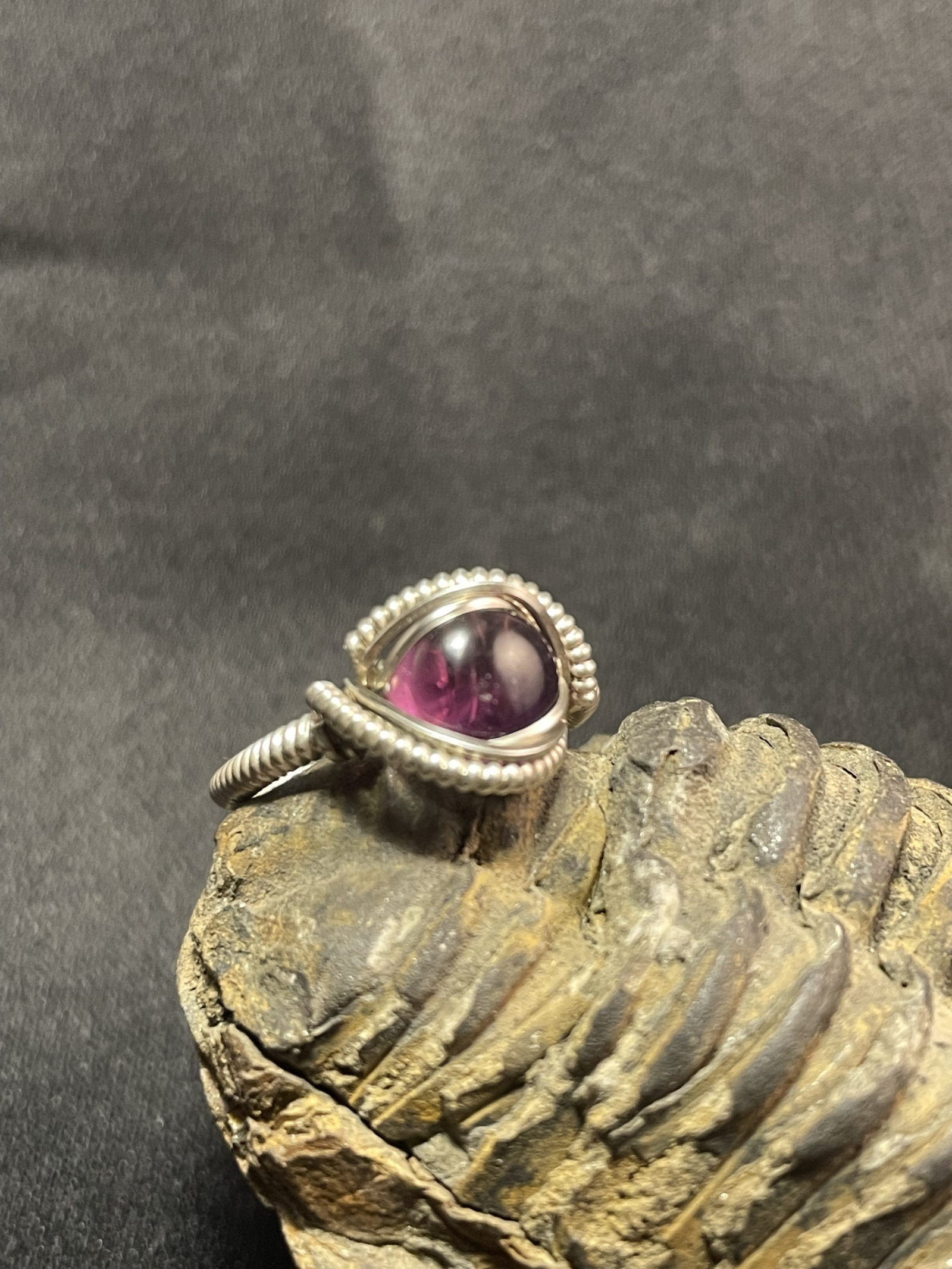 Handcrafted .925 Sterling Silver wire featuring a purple Amethyst cabochon that almost looks like it's glowing in the light