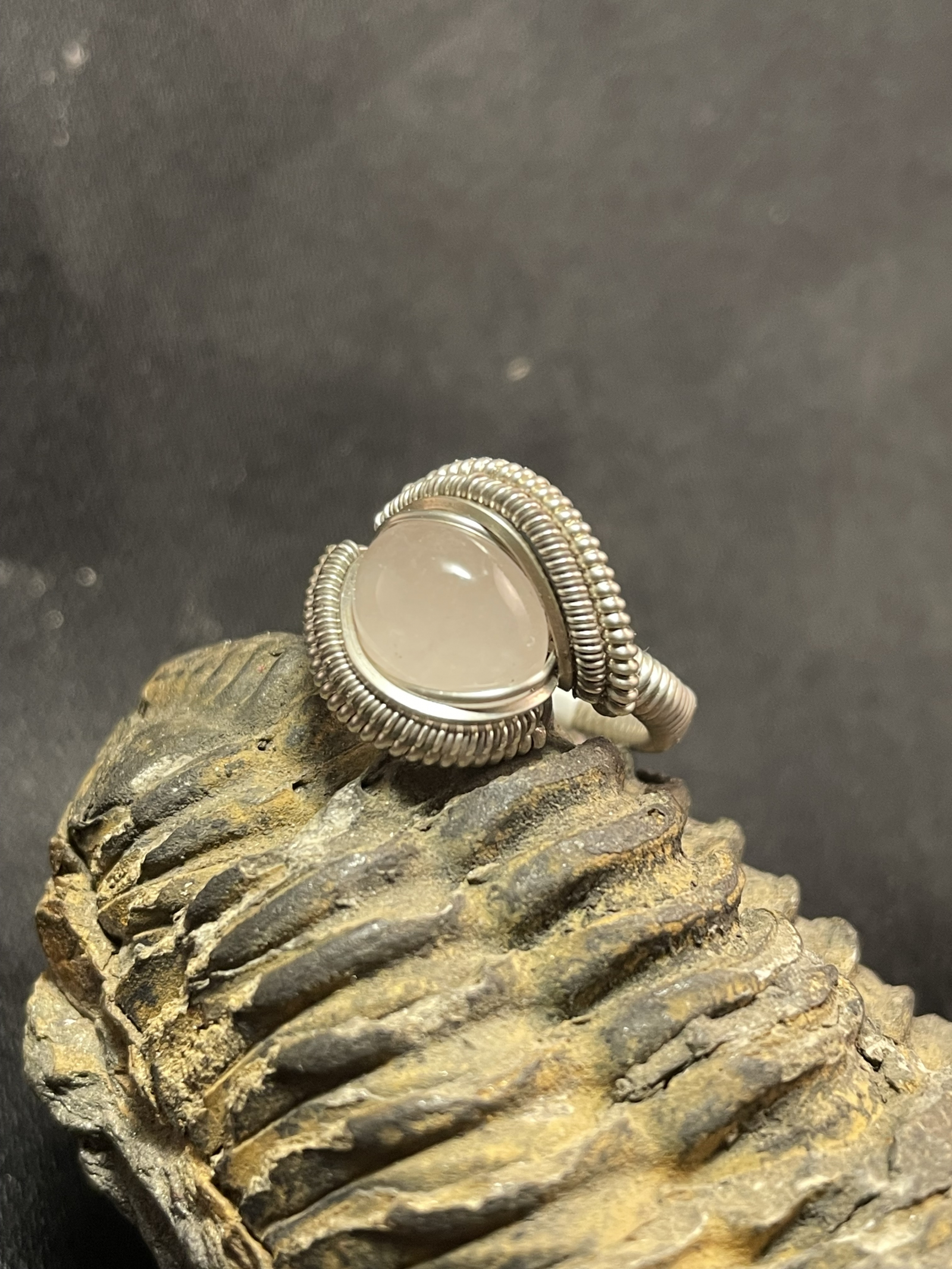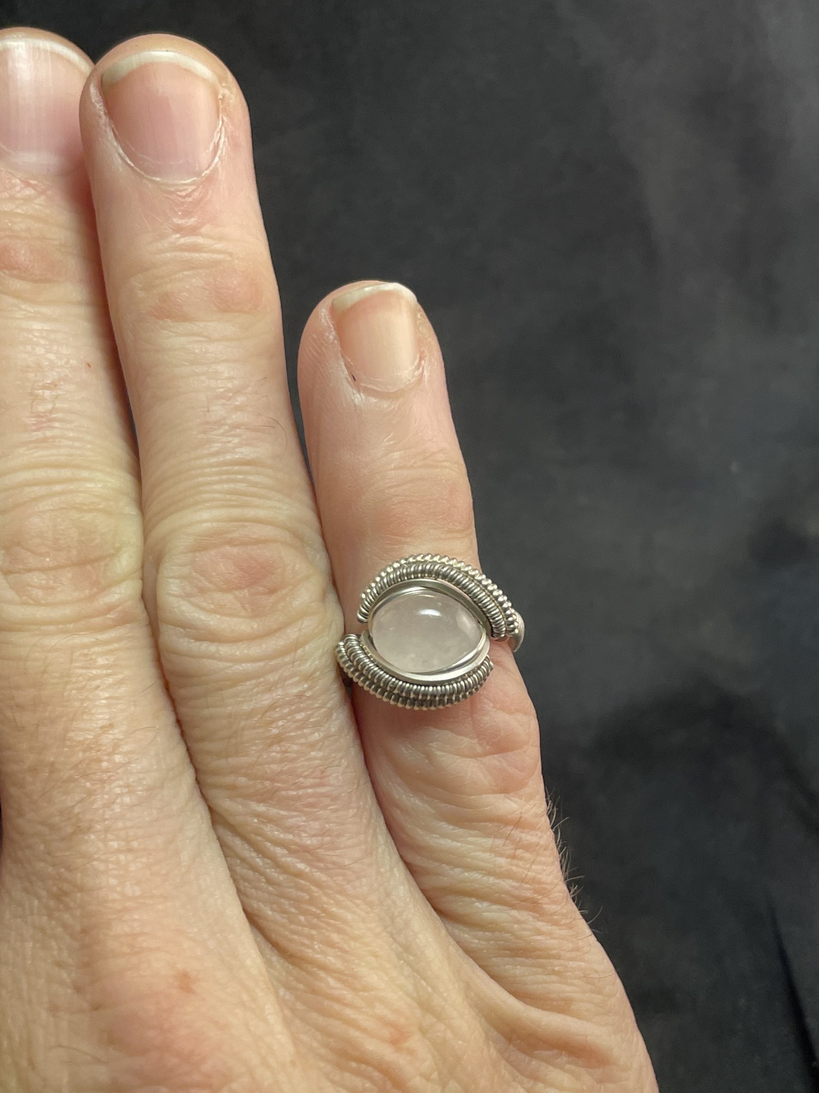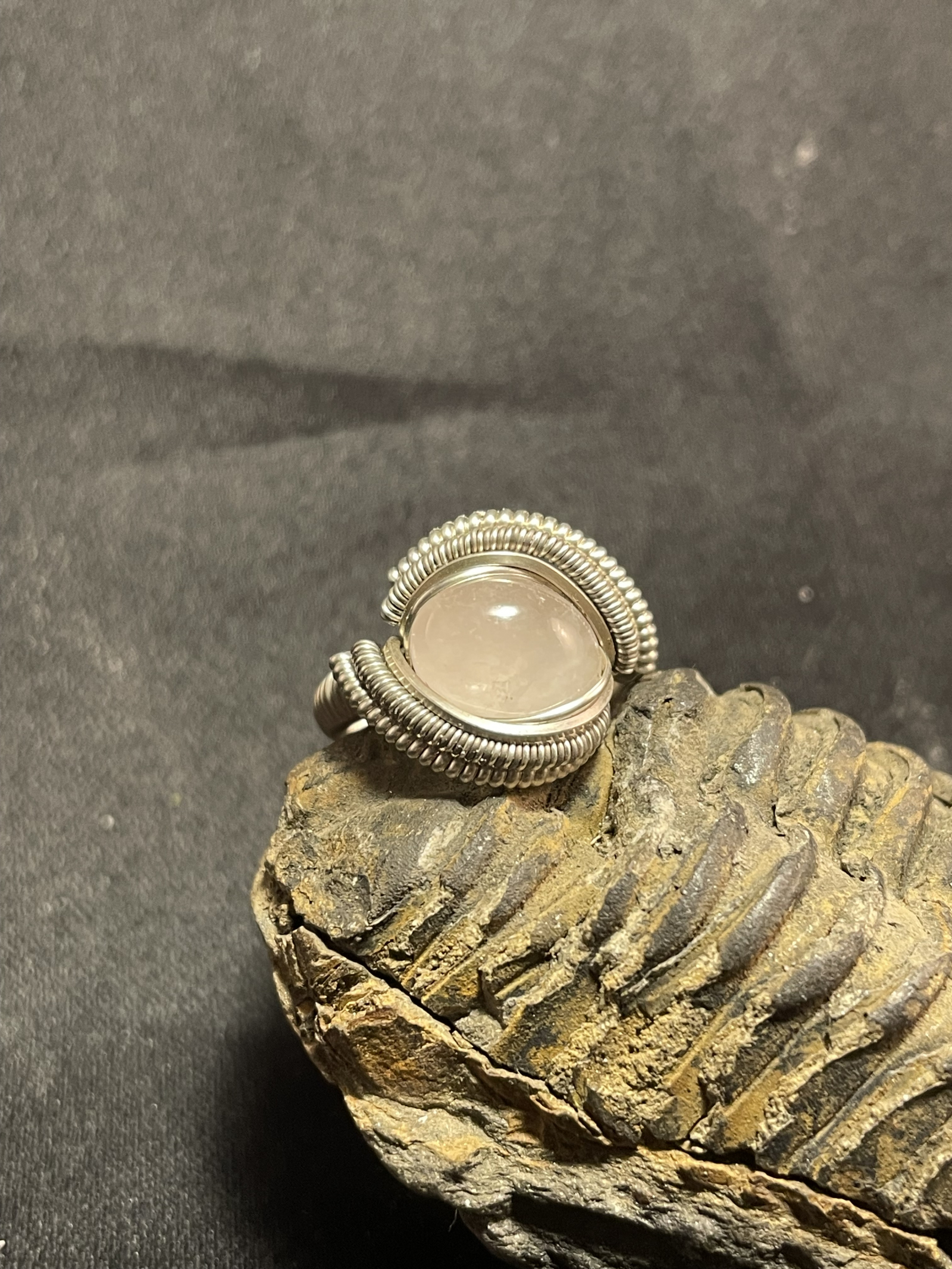 Handcrafted .925 Sterling Silver wire featuring a polished pink Rose Quartz cabochon